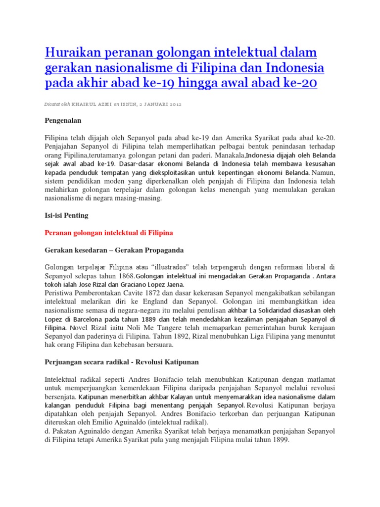 Huraikan Peranan Golongan Intelektual Dalam Gerakan Nasionalisme Di Filipina Dan Indonesia Pada Akhir Abad Ke Pdf